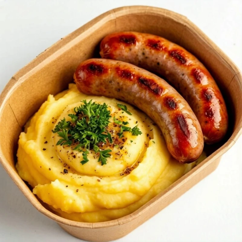 Картофельное пюре с колбасками из говядины на гриле