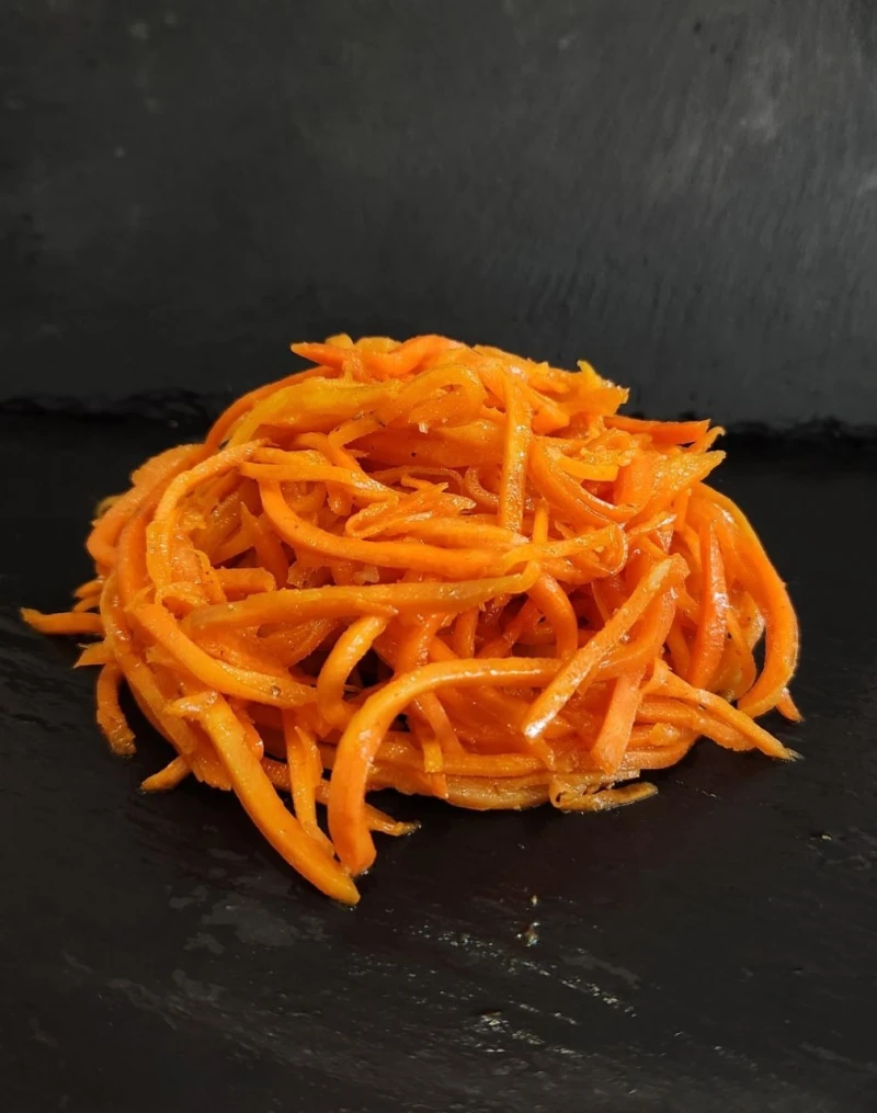 Морковь по‑корейски — острая хрустящая закуска с чесночным ароматом. Тонкая соломка, пикантный маринад, баланс жгучести и свежести.